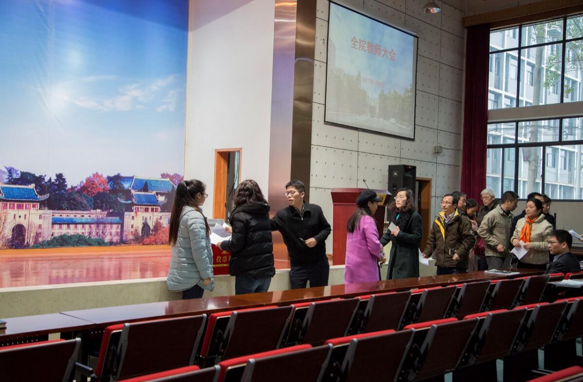 蒋明传达了《武汉大学事业发展奖励暂行办法》(2016年修订版)的文件精神。他结合我院事业绩效部分得分、得奖情况,如队伍建设(人才引进)、新增国家级虚拟仿真实验中心和本科教学等,具体解读《办法》的奖励项目及标准部分。他提醒各系、室、中心等做好学期末总结、收尾工作,关于即将举行的学院教职工代表大会代表选举工作,他希望各支部,各系、室、中心主任能积极配合,支持院工会顺利完成此项工作。在教授委员会换届选举投票推荐环节,蒋明阐述了换届的必要性和重要性,介绍了换届选举的方式、代表选举人数、任职条件,建议全体教师确保代表的广泛性,慎重投票。对于学院的发展,他表示,学院将坚持“个人-学科-学院”三位一体的工作格局,推出一系列改革政策、办法,推动学院更好发展。