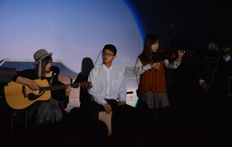 2013级临八、2014级临七临五、检验、口腔专业的十位才子佳人随之为大家带来沁人心脾的《乐器合奏》,优雅婉转的旋律勾起了大家对基础医学院的感恩与留恋之情。(图片七《乐器合奏》),2014级口腔医学专业同学表演的劲辣热舞《萨瓦迪卡》动作协调一致,节奏紧凑,好评不断;吉他弹唱《we can't stop 》的同学歌声甜美,让大家如痴如醉。