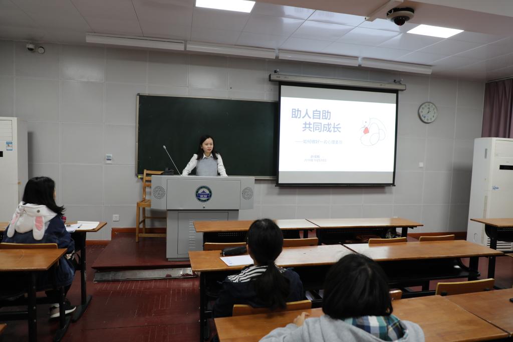 心协会长吴莉勤简单介绍了本次会议的目的,随后赵成毅开展了题为“助人自助,共同成长——如何做好一名心理委员”的主题培训。她通过一系列心理学小问题与心理委员进行互动,活跃了现场氛围,同时也让大家更充分地认识了自己。接下来,她围绕三个“什么”进行展开:“是什么”提出了心理健康的标准及心委的定位和职责;“为什么”表明目前在大学生中存在的问题和隐患凸显心理委员的重要性;“怎么做”中提到了心理咨询的定义和人们对心理咨询的误解,重点介绍了关注、倾听、鼓励、询问、反馈、报告等心理委员工作技巧。