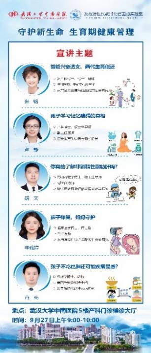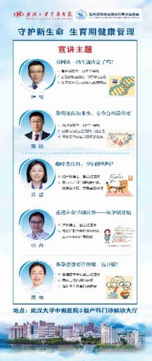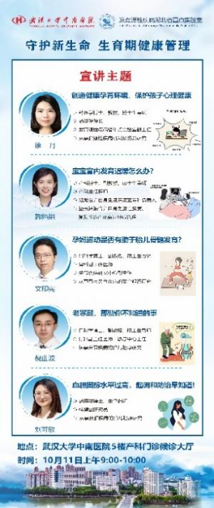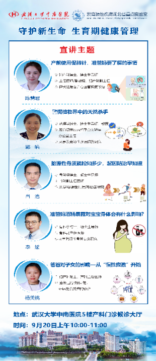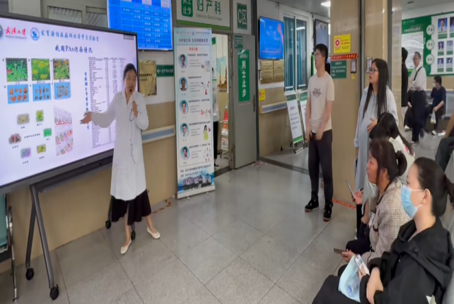 本次系列科普活动时间为9-10月,在武汉大学中南医院门诊与就诊人群面对面进行,科普宣讲人员汇聚了来自药理学、妇产科、生殖医学、儿科学、骨科学等多个学科的专家,他(她)们均是发育源性疾病湖北省重点实验室的PI团队成员。我院药理学系郭喻教授以“警惕植物界中的天然杀手”为题,揭开日常饮食中的潜在风险,生物化学与分子生物学系商亮老师深入浅出地解释了“节俭表型”与子代健康的关系;药学院徐丹院长则探讨了孕期环境对胎儿心理健康的深远影响。同时,中南医院的临床妇产科、生殖医学、骨科和药学部的科普宣讲人员也从用药安全、营养管理、父亲角色、围产期干预等不同角度,为准爸妈们提供了全方位、可操作的指导。科普宣传内容的讲解紧扣生活实际,且前沿、生动、有趣,不仅传递了知识,更传递了一种“主动健康、科学规划”的新生育观。