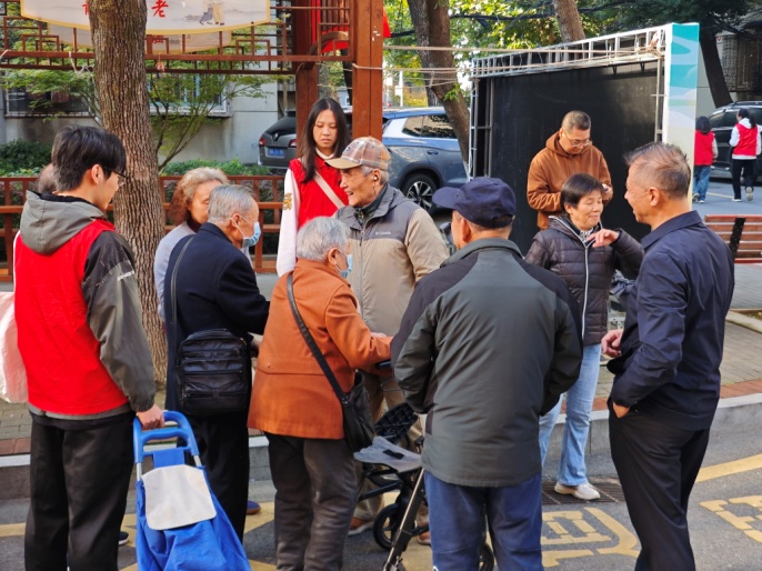 随着活动的启动,到达现场的老同志越来越多,他们有的结伴同行,漫步徜徉,相互交流幸福的退休生活心得。有些老同志漫步来到陈家山超市门前的清风敬老亭,坐在亭内的长排座椅上,相互交谈,处处洋溢着欢声笑语。参加活动的约120位退休老同志来自基础医学院不同教研室,老同事和老朋友相聚格外开心,重逢的喜悦之情溢于言表。虽然大多数老同志们住在同一社区,但是由于年事已高,行动不便,平时来往交流较少。还有一些老同志已经搬离陈家山社区住在较远的城市社区,这些老同志与过去的同事们的交流机会就更少了。每年重阳节来临之际,老协组织举办的主题活动就成为所有老同志们翘首以盼的重逢交流的大好机会。
