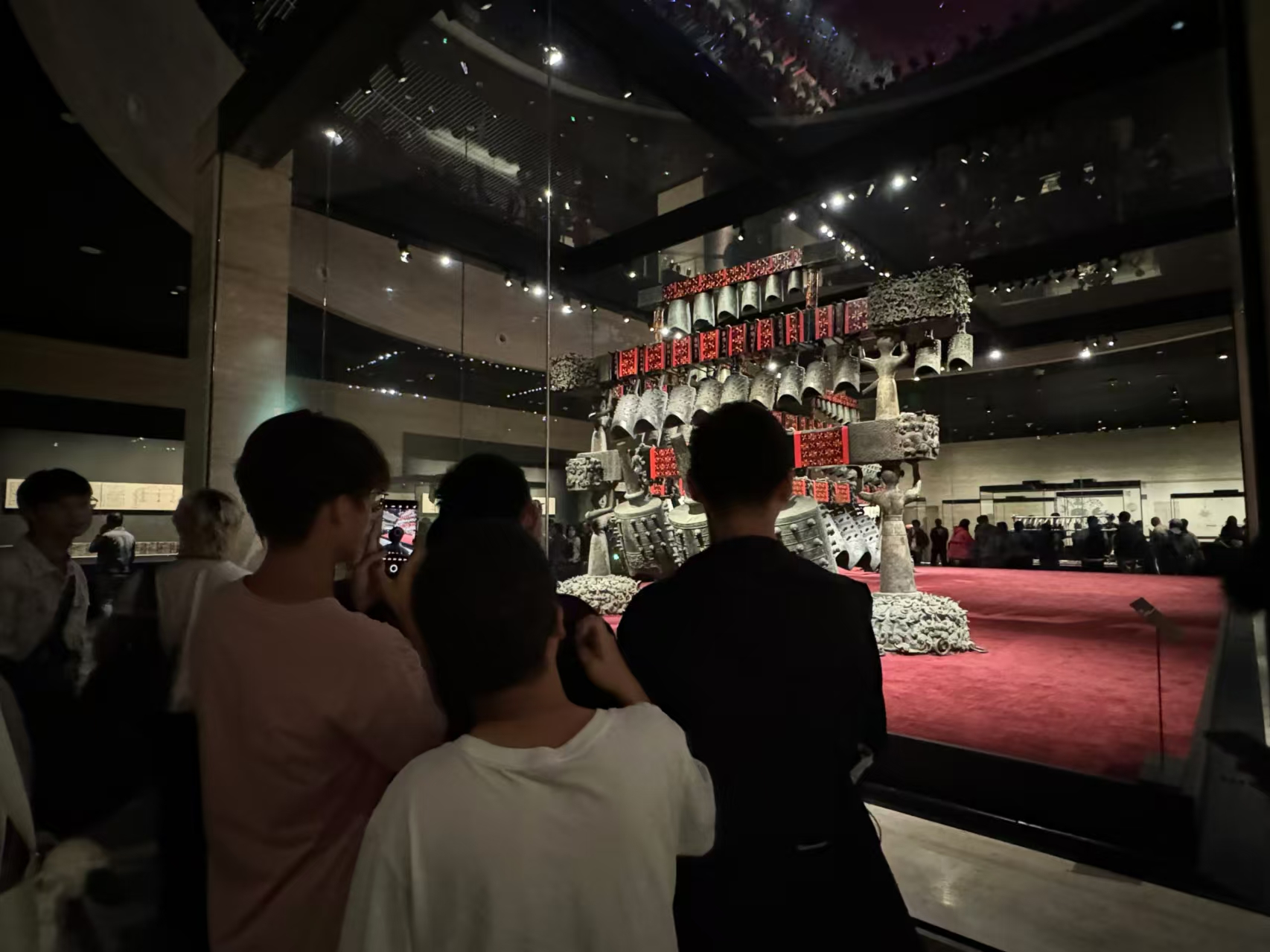 进入省博物馆后,映入眼帘的是“曾侯乙”展厅,展厅中最著名的曾侯乙编钟是战国时期的重要文物,由65件青铜钟组成,每件都能奏出三度音阶的双音。这套编钟不仅展示了古代音乐的高度成就,还体现了当时先进的铸造技术和音乐理论。同学们有序进入“越王勾践剑”展厅,越王勾践剑出土于湖北江陵望山1号墓,剑身长55.7厘米,千年不锈。其锋利的剑刃和精美的装饰工艺展示了春秋晚期吴越地区卓越的冶金技术和锻造水平。