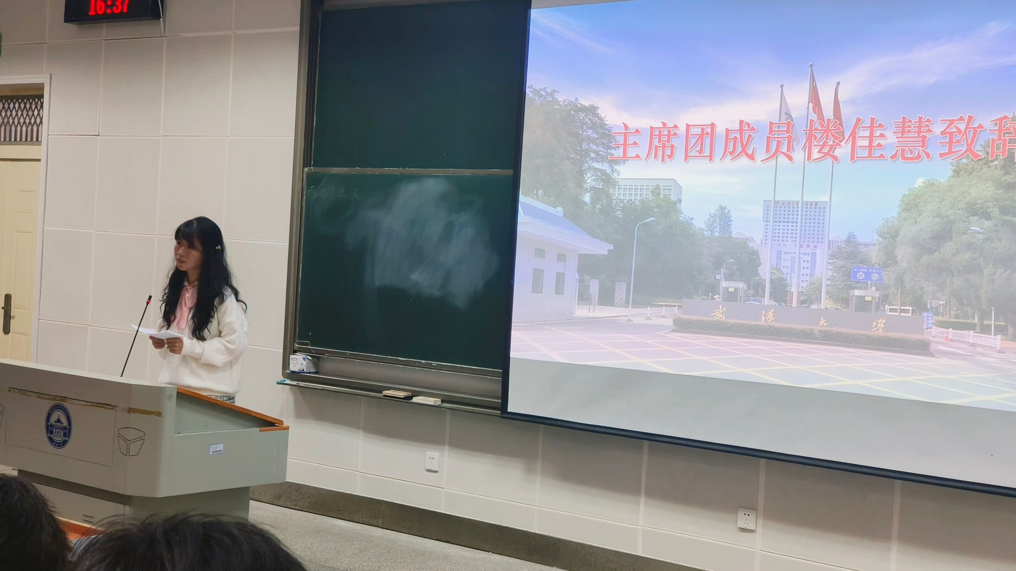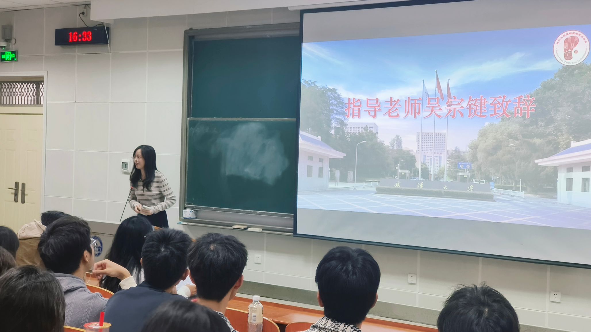 会议第二项,学生会指导老师吴宗键、杨晨涛发表致辞,两位老师对新生的到来表示热烈欢迎。吴宗键对学生会成员提出了两点期望:增强责任感、提升团队合作意识以及加强团队协作能力,她希望院学生会能够不断革新,努力成为有温度、可信赖的学生会。杨晨涛提到,学生会要培养服务意识,秉承方便同学、帮助同学、服务同学的工作宗旨,做师生沟通的桥梁,他强调,学生会成员要培养创新精神,在未来工作中要保持良好沟通。