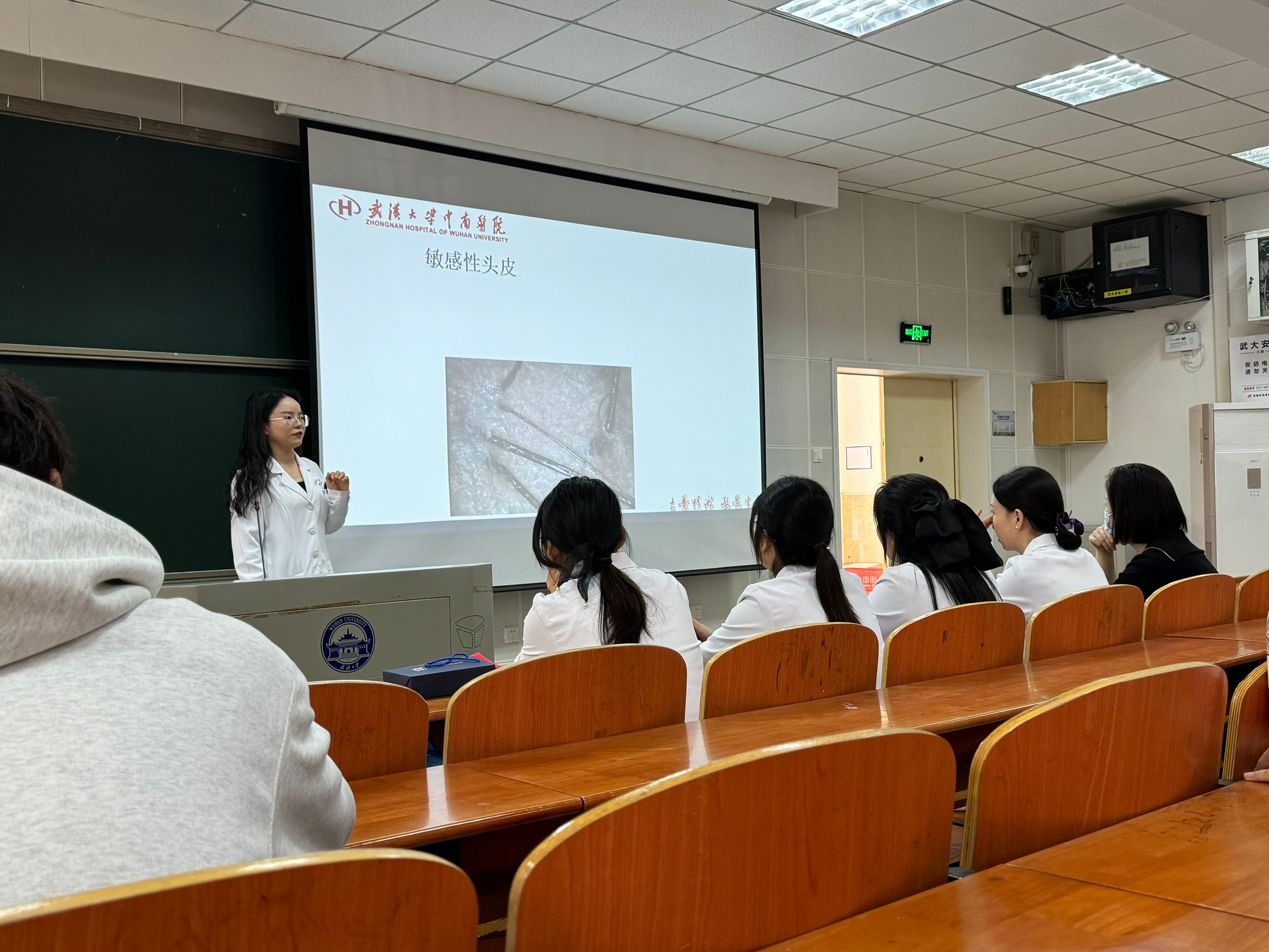 活动伊始,李倩倩医生以脱发的防治为主题开展讲座。分析男女脱发的特征脱发的原因等,并在合理护发、脱发的治疗方面给予同学们科学的建议。