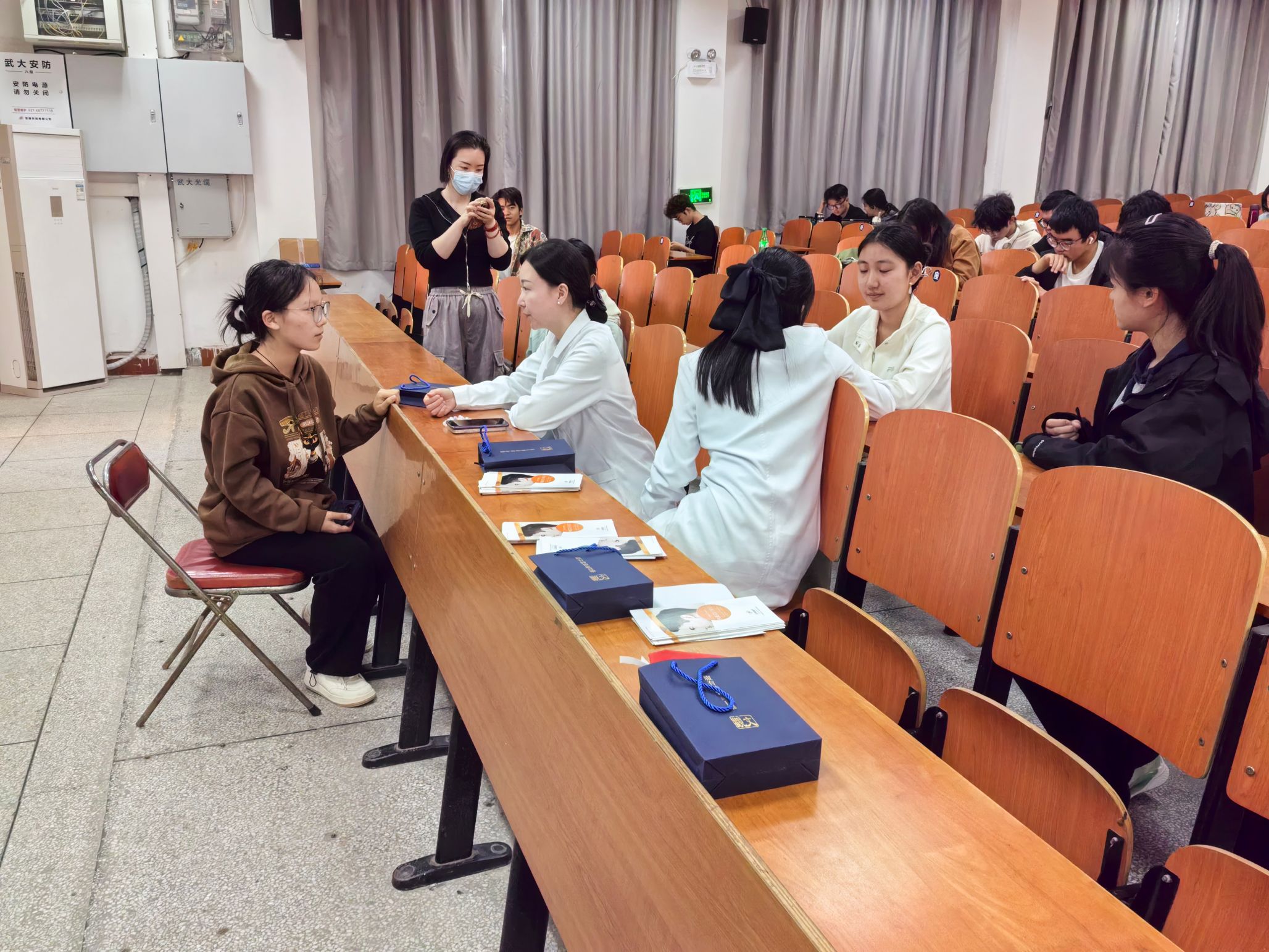 义诊活动环节,同学们积极与在场医生互动,询问有关皮肤美容、整形美容及脱发方面的问题。医生耐心细致的回答讲解,针对同学们个性化的问题给予科学的指导。中南医院整形植发团队专家还带来了毛囊检测仪,为有毛发困扰的同学们进行检测与分析。