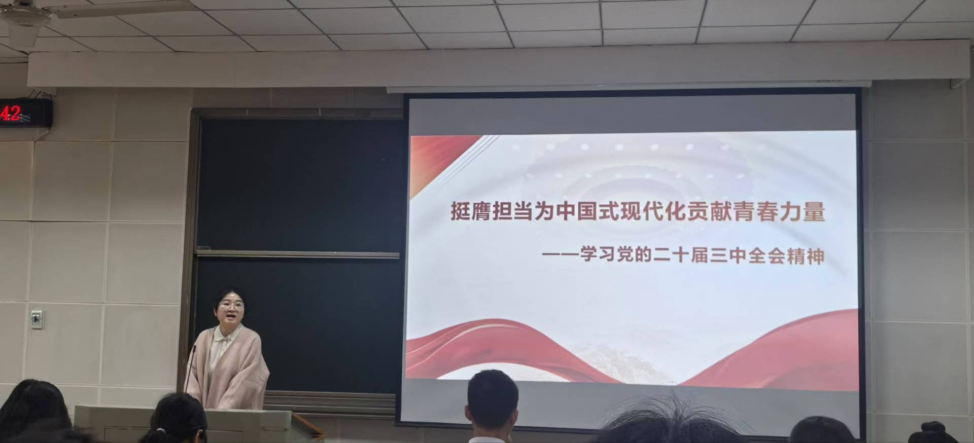黄兆琼老师从会议公报原文出发,介绍“十四个关键领域”和“七个聚焦”等重要内容,希望同学们深刻领会并学习党的二十届三中全会重要精神,要一以贯之“坚定不移听党话,矢志不渝跟党走”的理想信念。