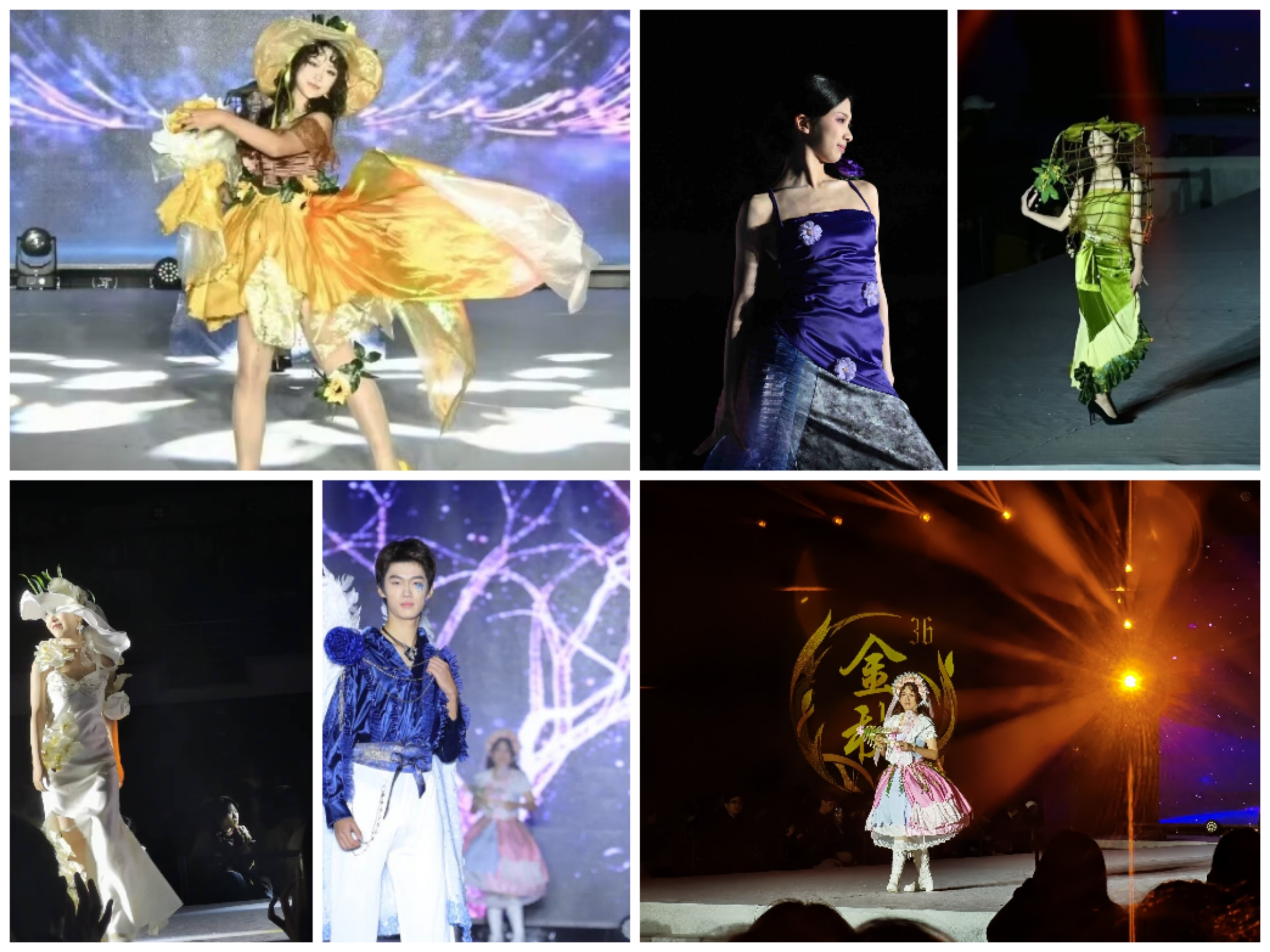 首先上场的是向日葵花仙子,以黄色为主色调的裙摆在舞台灯光下彰显明媚与活力。紧接着鸢尾花仙子走上舞台,紫色的裙摆随着模特的步伐绽放在灯光下,像朵朵盛开的紫色鸢尾带来吉祥幸福。桂花仙子以花藤编制的帽子拟合桂花树的枝条,淡黄色的绒球穿插其中,宛若一簇簇盛开的桂花。蝴蝶兰仙子一袭曳尾白裙,身上盛开一串串纯白蝴蝶兰,纯洁高雅,摇曳生姿。男装勿忘我,蓝色衬衣上点缀串串流苏,身后白色翅膀张开象征勿忘我的花语不变的期望。蔷薇仙子胸前的一朵蔷薇花从肋骨间绽放,展现出蓬勃的生命力。