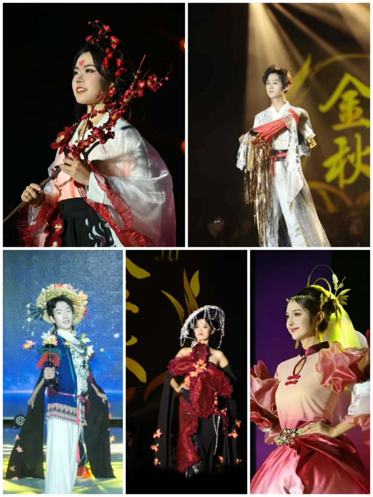 梅花仙子红袖白衣宛若点点红梅绽于大雪覆盖的九州大地,更有梅花枝条沿腿部盘旋而上,凌然独放。男装银杏手持流苏伞登台,如同画中走出的翩翩公子,温润如玉,坚韧沉着,于秋日落得满身金黄。男装木棉紧随其后,富有民族特色,平和的色调代表木棉的纯洁与纯真。紫荆花仙子登台,黑色与红色的大胆碰撞,热烈展现团结和民族精神,美丽骄傲。最后压轴的是“花中之王”牡丹,华贵艳丽,模特两侧大朵的牡丹尽显国色天香。