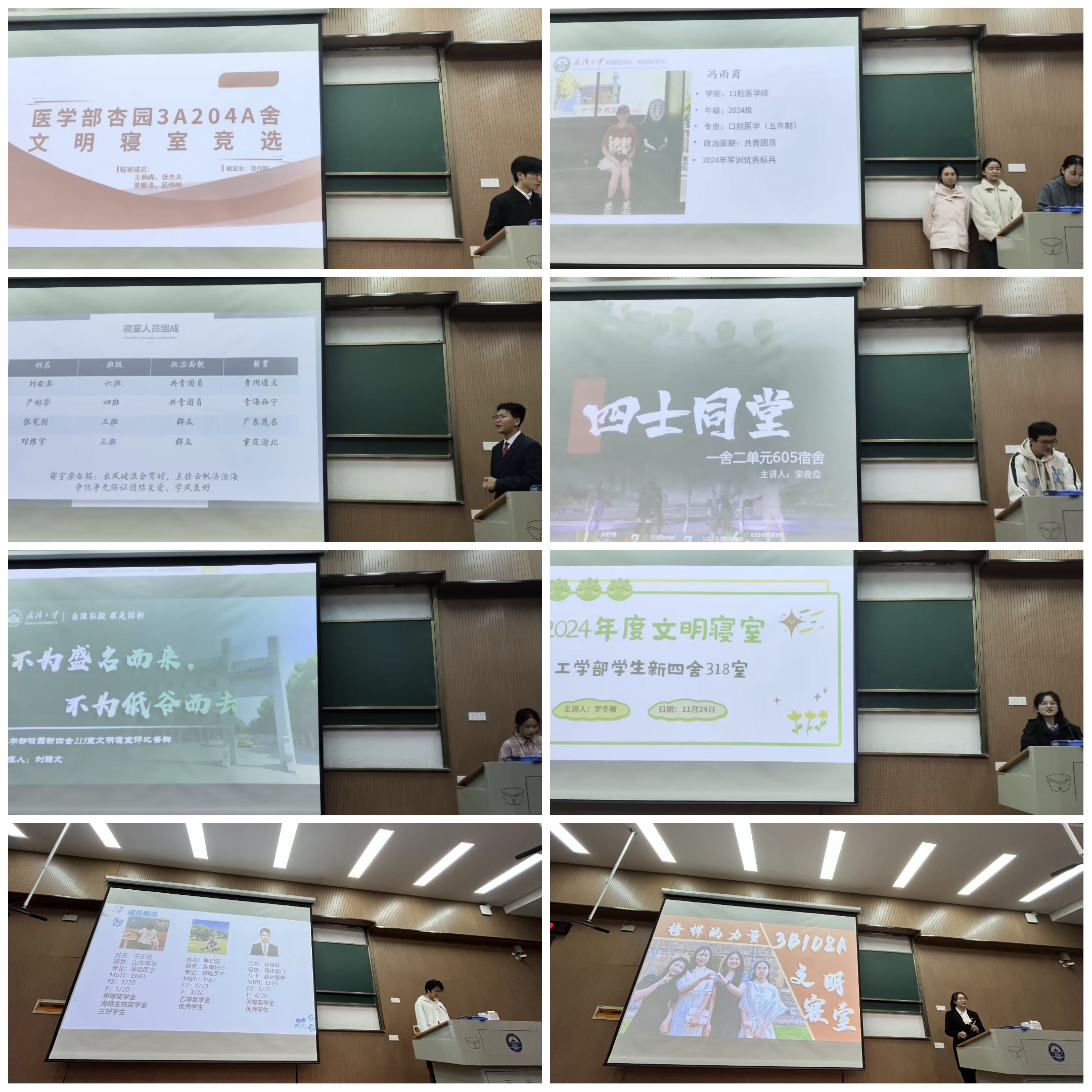 “文明寝室”评选答辩现场,参评寝室尽展风采。他们以一面面荣誉墙展现拼搏历程,用真挚的笑容传递和谐友爱的寝室文化,更通过感人至深的故事彰显温暖而团结的精神风貌。有的寝室专注学术、追求卓越,用优异成绩与勤奋态度阐释对科研的不懈追求;有的寝室热爱生活、勇于担当,以奉献和拼搏诠释文明的内涵。尽管每间寝室风格迥异,但都秉持着同样的目标:追求建设全面发展、文明和谐美好的寝室环境。