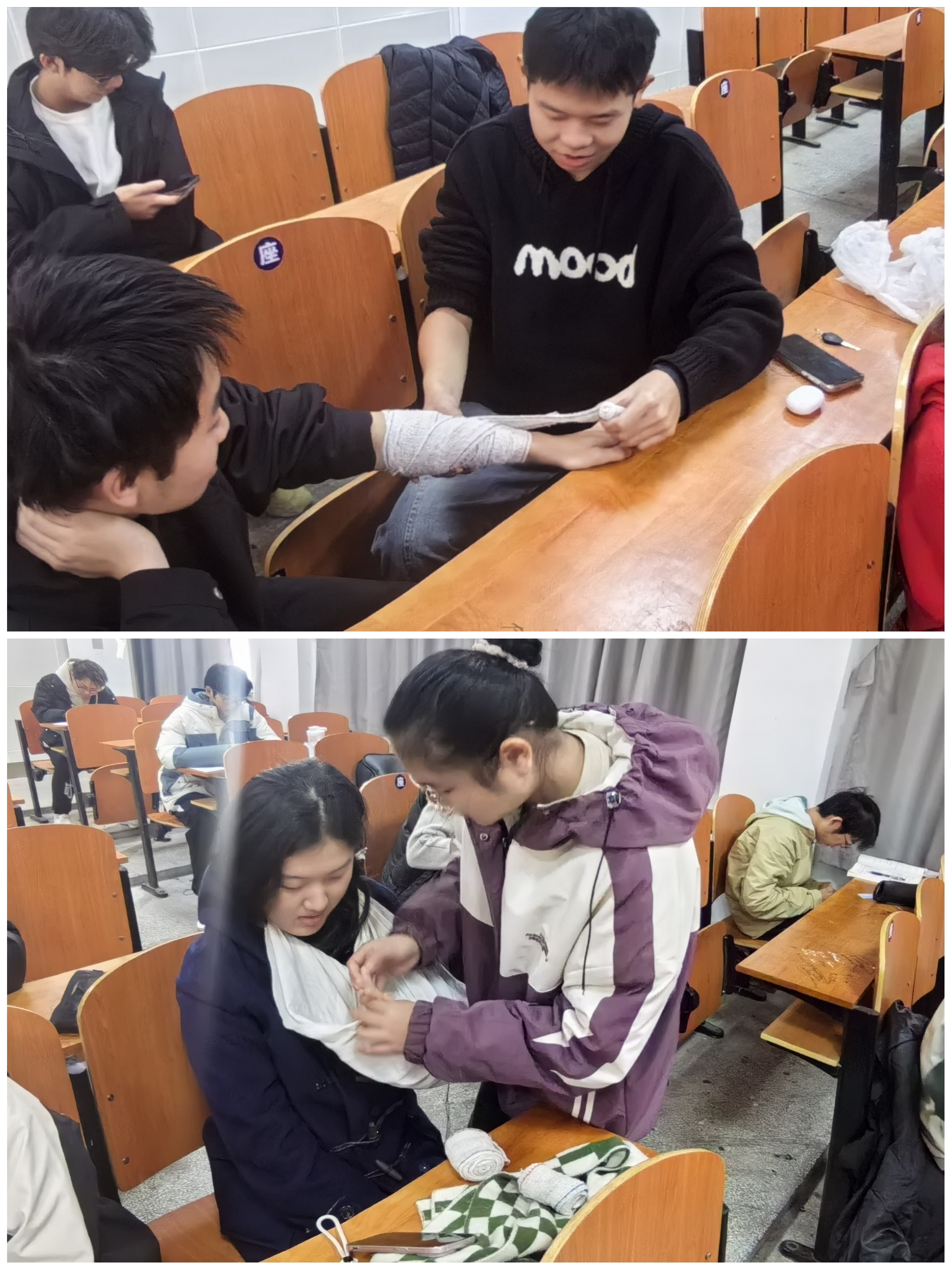 课程第二部分,现场体验、实践操作。理论知识讲解结束后,主讲人邀请同学上台,亲自展示实践操作技术。受邀同学们现场体验了包括包扎、固定在内的各种基础急救措施。与此同时,现场助教们也向台下的同学们分发了绷带、三角巾以及其他重要的医用器械让同学们亲眼看到急救技术实际操作的同时,也能够亲自体验,领会急救过程中的关键要领和技巧