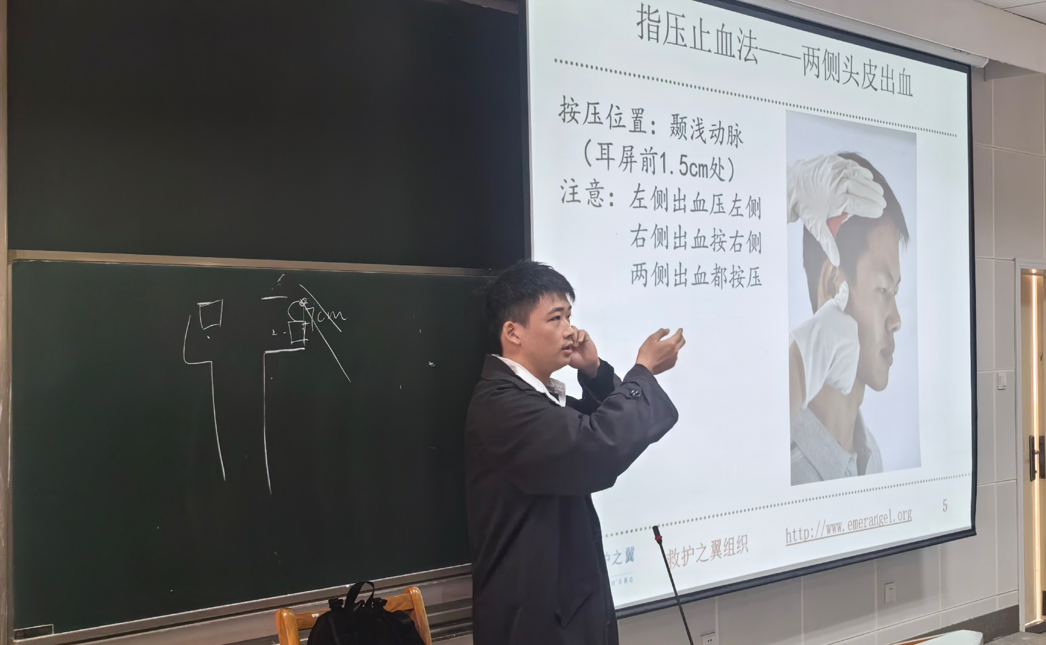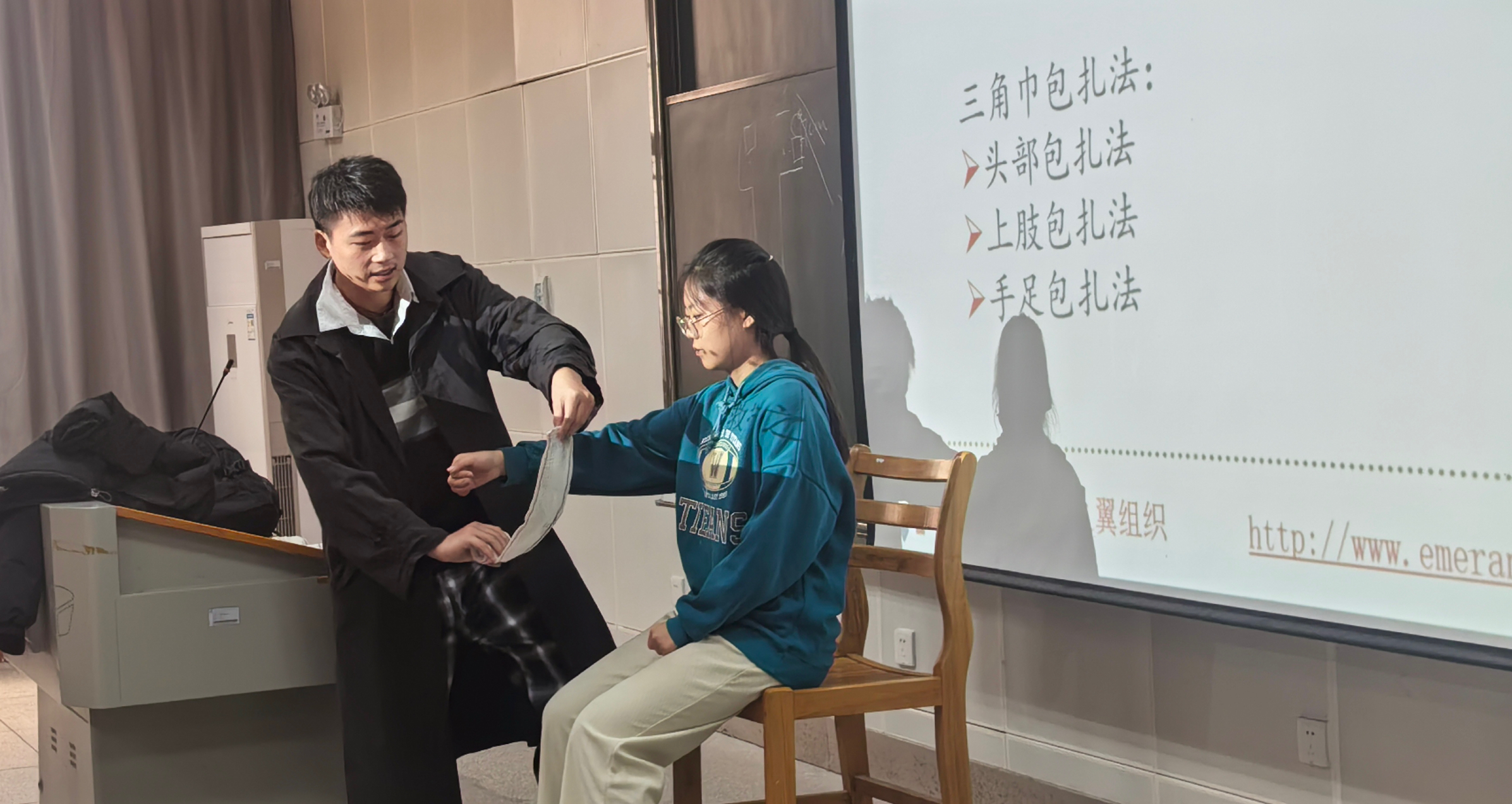 主讲人演示包扎技巧)