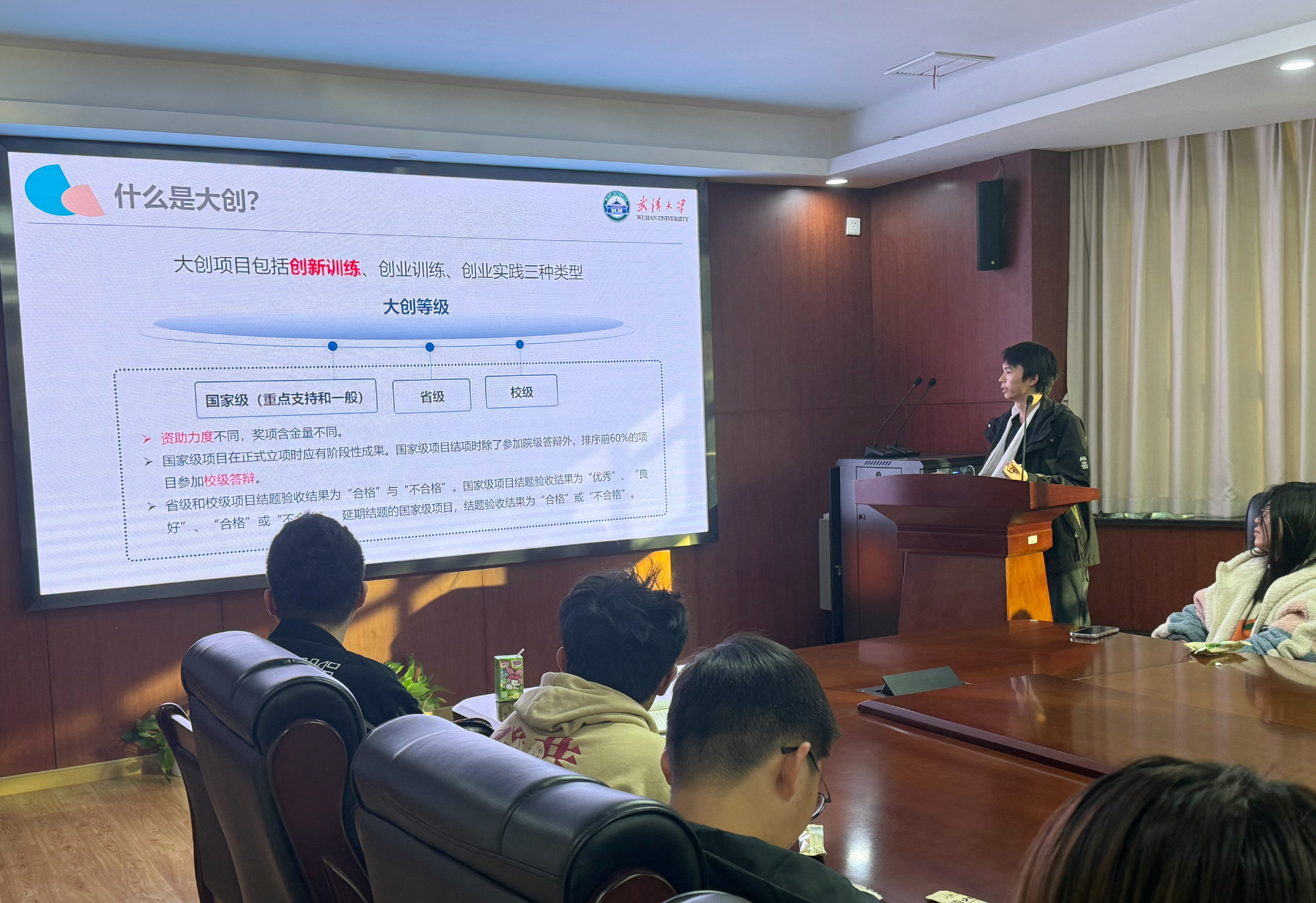 龙昱敏同学就学院综测细则、参与大创项目等进行分享。他解释了综测的各项评分标准和细则。此外,他还分享了自己参与大创项目的经验和心得,详细介绍了项目的申请流程、团队组建、项目实施以及成果展示等各个环节,鼓励同学们积极参与科研和创新实践。