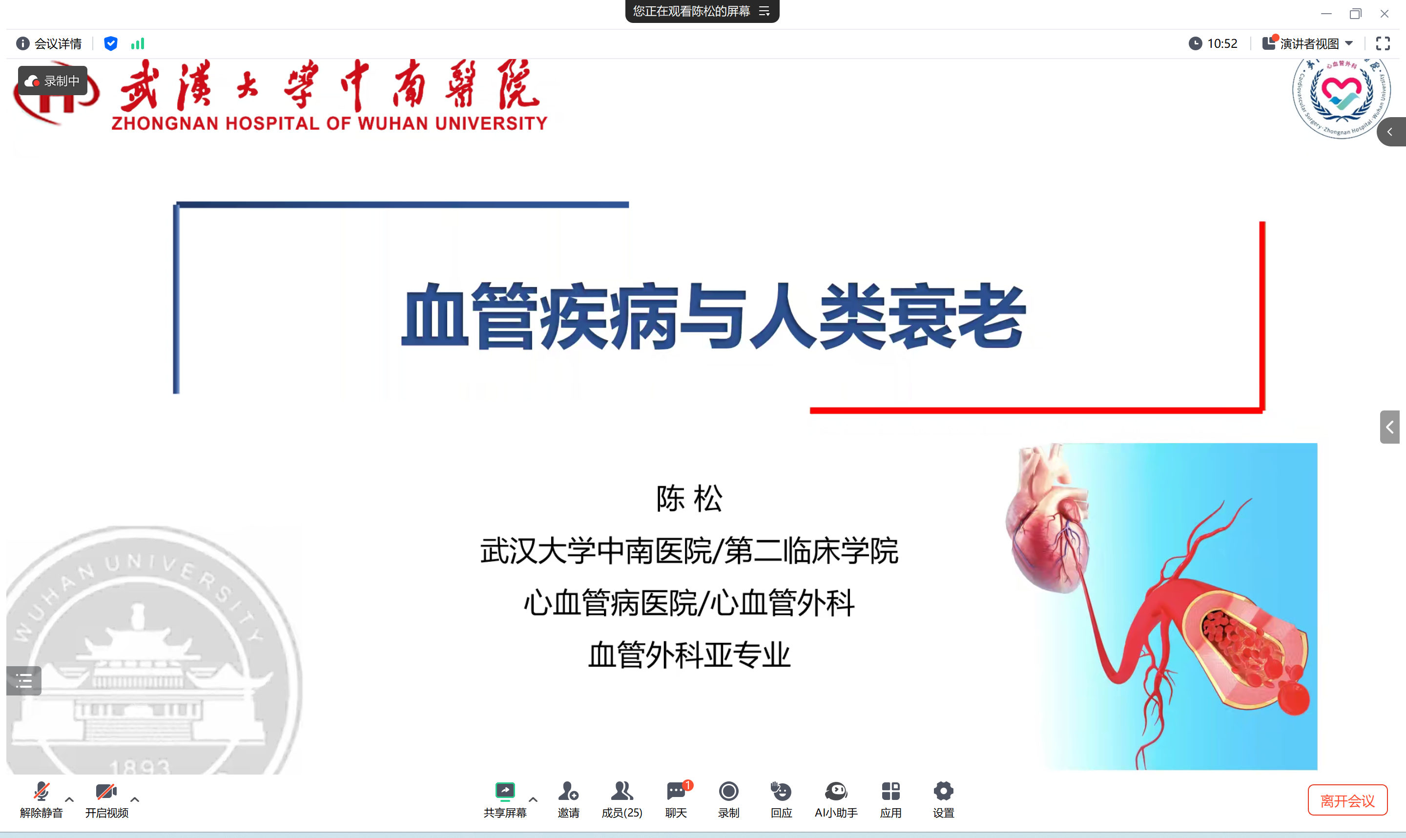 接着,陈松老师带来《血管疾病与人类衰老》主题报告。陈松老师以清晰易懂的话语,为大家深入浅出的讲解了健康的血管形态是什么、如何判断血管的状态以及血管疾病的高危因素,并揭示了人与血管同寿的奥秘。陈松老师着重强调了心血管疾病日渐“年轻化”趋势,并向同学们分享了分享如坚持锻炼、合理饮食、规律作息等养护血管的方法,殷切期望同学们将健康维护融入日常点滴,从平常小事筑牢健康防线。