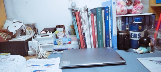 寝室环境整洁,书桌上摆满了笔记本和专业资料,墙上还贴着激励自己的标语,让整个寝室充满学术氛围与生活气息。