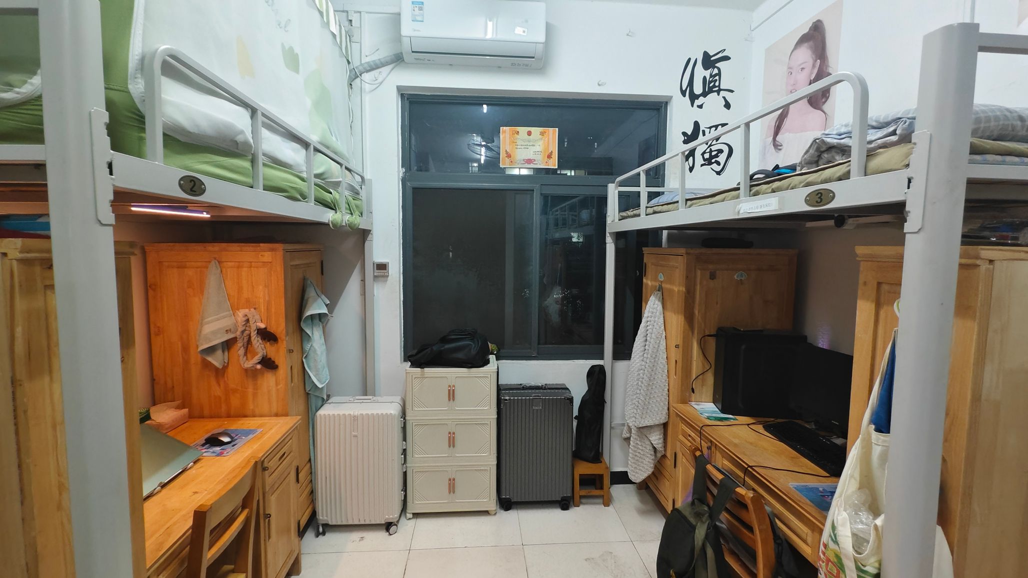 他们的寝室空间规划井然有序,杂物统一摆放,行李箱在角落有序排放,整个寝室看着简洁大方。