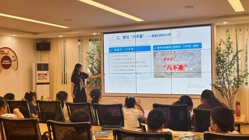 课堂上,志愿者化身“急救小老师”,以生动的PPT演示搭配通俗讲解,系统传授安全知识:从如何识别池塘、深沟等危险水域,到熟记未成年人防溺水“六不准”原则;从溺水后的自救技巧与科学施救方法,再到心肺复苏(CPR)的完整操作流程、创伤急救的基础要点与暑期高温天气下的热射病防护知识……。孩子们专注倾听,频频举手提问,现场互动热烈,安全知识在问答间逐步扎根。