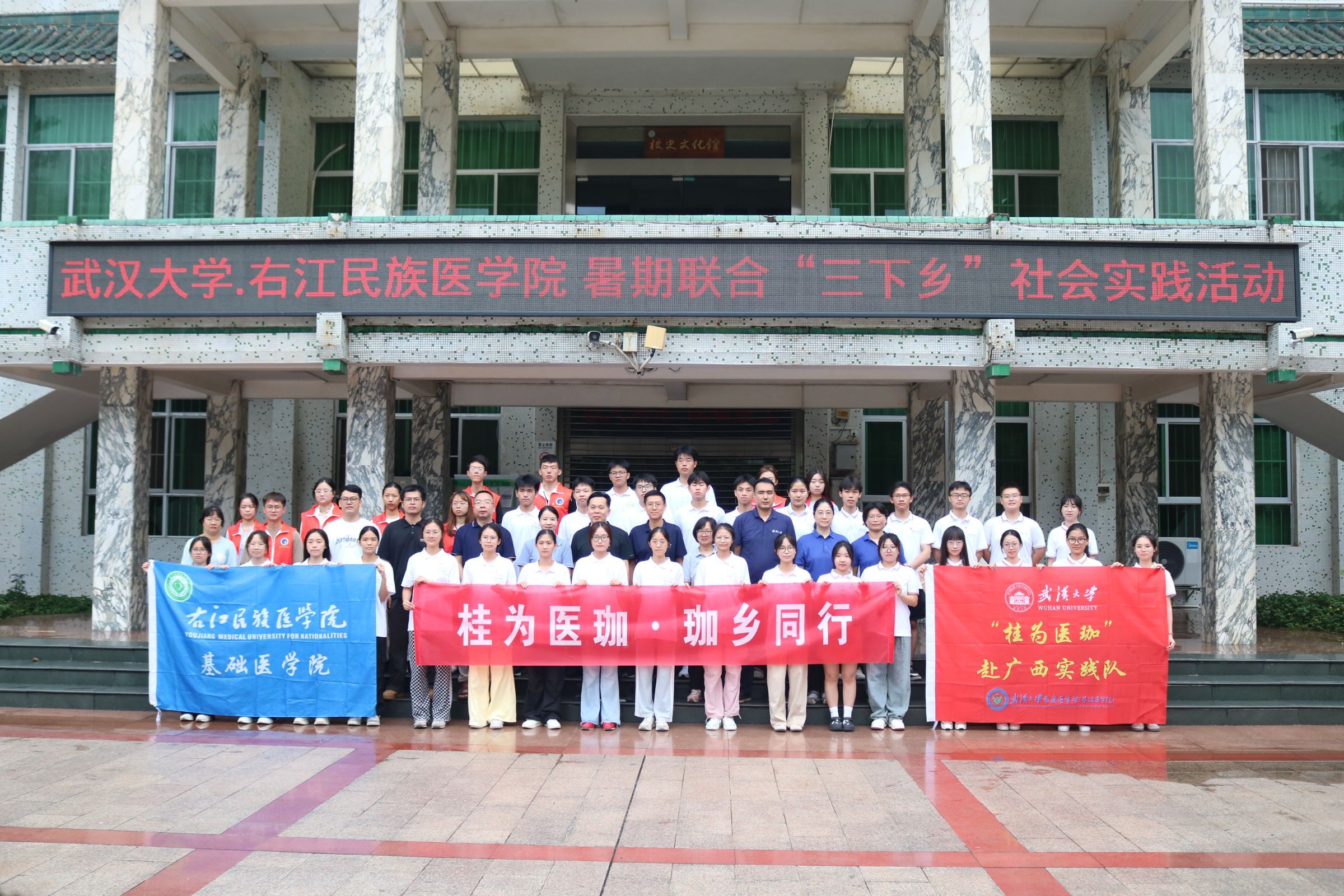 2025年7月12日早晨,学院“桂为医珈”实践队与右江民族医学院乡村振兴同心实践团在右江民族医学院顺利会师。两校师生友好问候,热情交流,并在右江民族医学院图书馆前合影留念。金色晨晖轻洒校园,即将启程西林县的同学们朝气蓬勃。