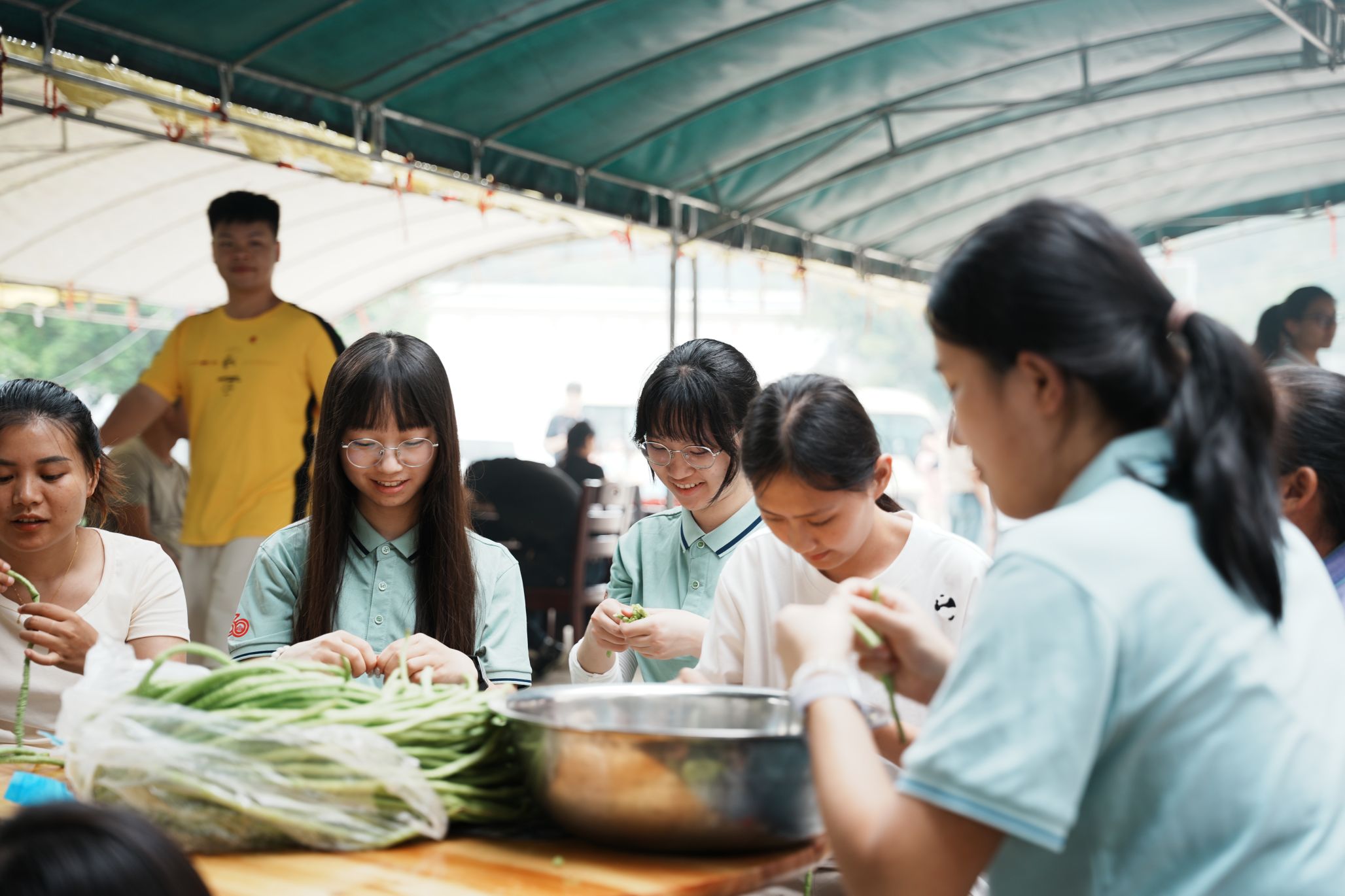 正午时分,炊烟袅起时,村部后厨正上演其乐融融的大锅菜协作。村民大厨掌勺炝炒时蔬,队员清点免洗餐具,将一次性碗筷杯子、饮料码放齐整。