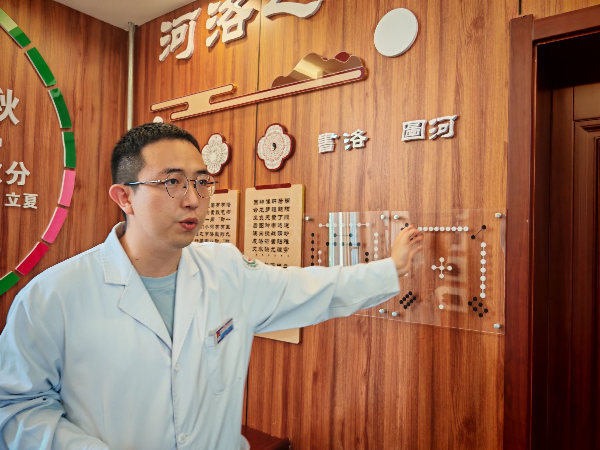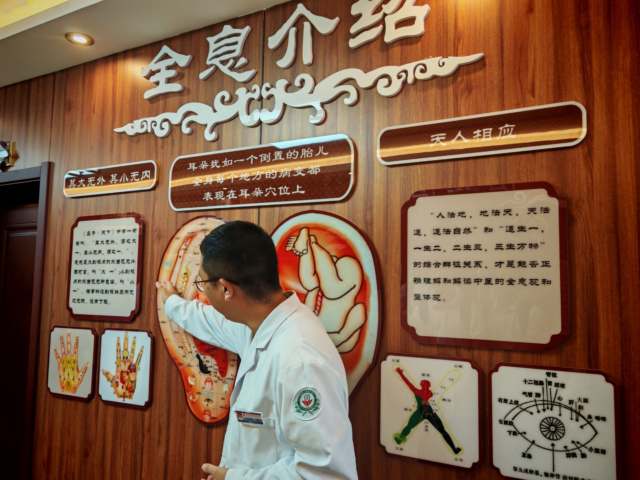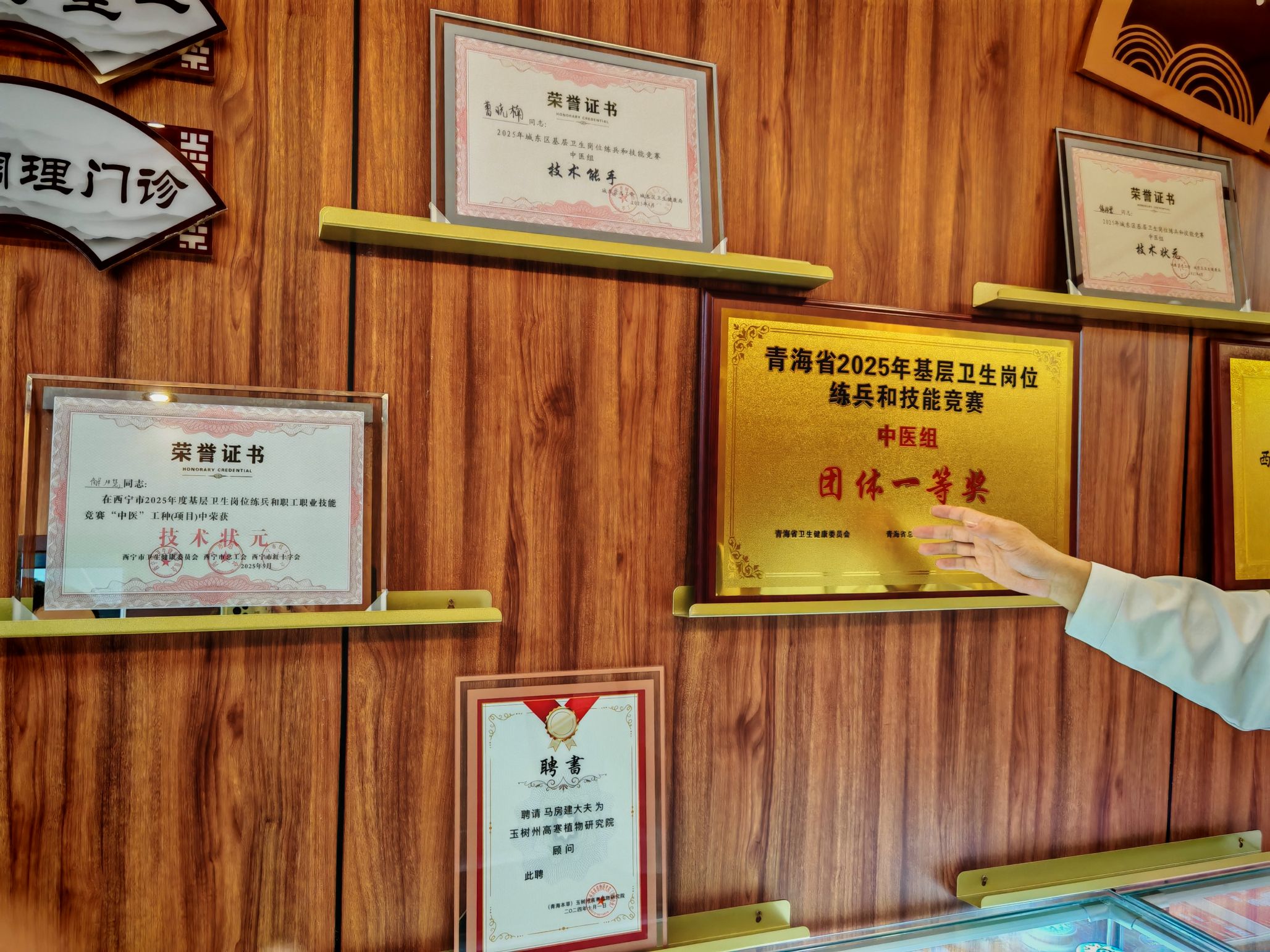 步入卫生院二楼,浓郁的药香扑面而来。古色古香的中医馆内,中药材标本静静诉说着千年的智慧,中医发展历史墙记录着文明的传承。曹晓楠医生介绍了蒙医"三根学说",马房健医生则用荔枝、枸杞等常见药材为我们解释中医的阴阳辩证。荣誉墙上,2025年基层卫生岗位练兵和技能竞赛中医组团体一等奖的奖牌熠熠生辉。最引人注目的莫过于那面由专业术语巧妙构成的"文化墙"——中、藏、蒙三个大字巍然矗立,仿佛在向我们讲述着这片土地上医学文明的交融共生。蒲院长为大家介绍了其中的含义。在青海,不同民族的医学不是非此即彼的选择题,而是相互借鉴、共同发展的多选题。这份包容与共生的理念,让在场的每一位实践队员都为之动容。
