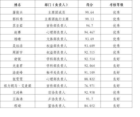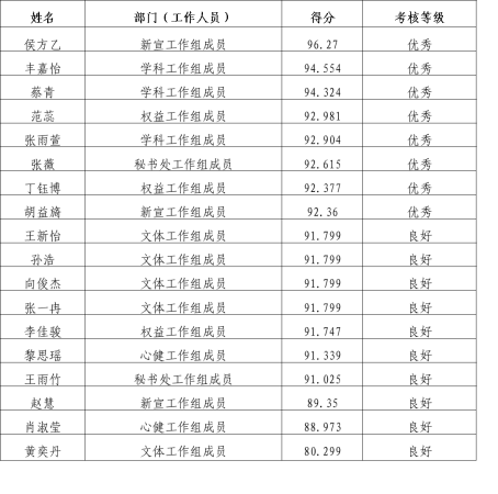 按照《武汉大学基础医学院第九届研究生会终期述职评议方案》中考评的相关规定,并结合2024—2025学年各部门和工作人员实际工作情况,由评议小组进行打分,经与中期述职评分折算后,现将结果公示如下(公示期2025.5.20—5.23):