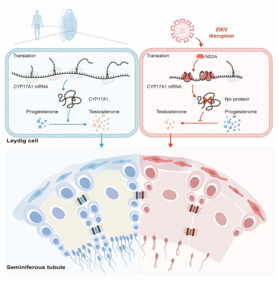 近日,OD平台(基础医学院)/高致病性病毒与生物安全全国重点实验室吴莹教授团队在学术期刊Nature Communications上发表了题为“ Zika virus disrupts steroidogenesis and impairs spermatogenesis by stalling the translation of CYP17A1 mRNA”的研究论文。该研究发现,寨卡病毒(Zika virus,ZIKV)的非结构蛋白NS2A通过直接结合睾酮合成关键酶细胞色素P450 17A1(17α-hydroxylase/17,20-lyase, P450c17/CYP17A1)的mRNA,抑制其翻译,干扰睾酮生成。这一发现揭示了ZIKV损害男性生殖健康的新机制,为相关治疗策略提供了潜在靶点。