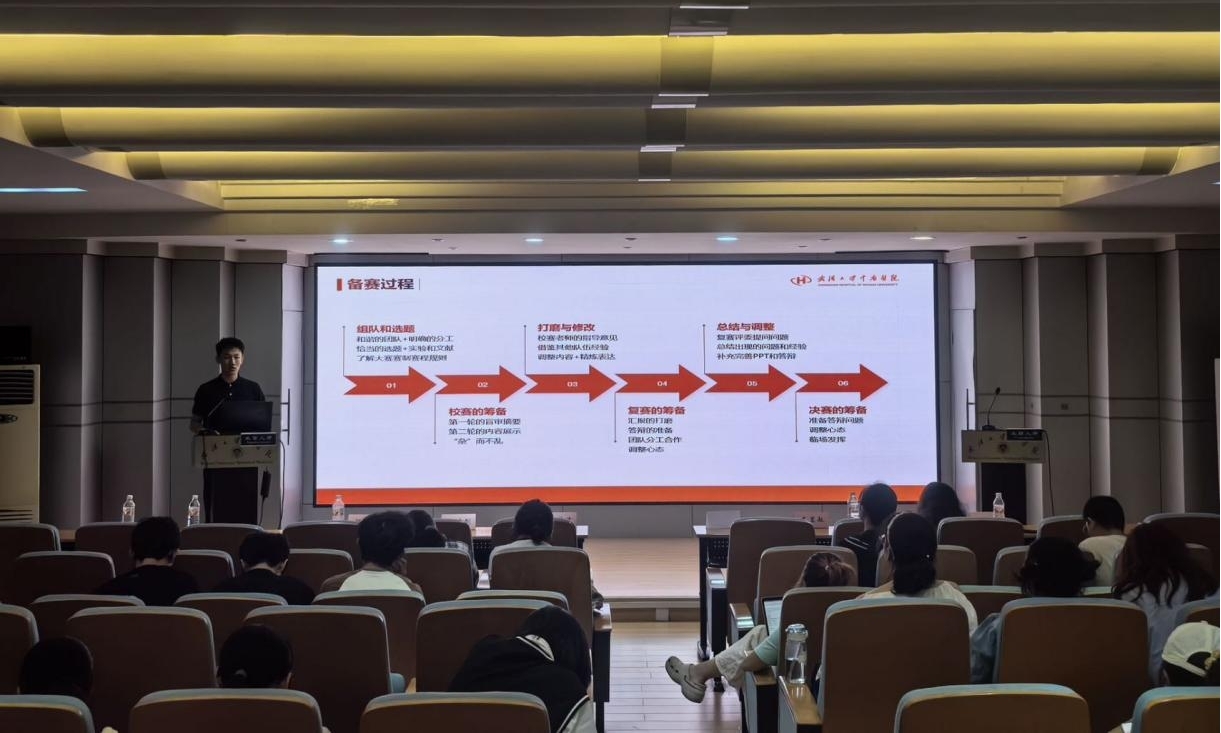 来自武汉大学大学生创新实践中心的王秋雯同学、武汉大学大学生创业促进中心的胡成超同学分别为同学们解读了”挑战杯“全国大学生创业计划竞赛和中国国际大学生创新大赛的相关政策要点,详细介绍了赛事流程、评审标准和备赛要点。