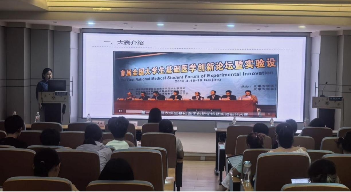 学院实验教学中心杨哲琼老师针对基础医学研究暨实验设计大赛作了专题讲解。她指出,基础医学研究不仅需要深厚的理论功底,更需具备将理论转化为实践的能力。她鼓励同学们勇于尝试,敢于突破,将所学知识应用于解决实际问题中。同时,还分享了实验设计的技巧与方法,强调了团队协作的重要性,并鼓励同学们积极组队,共同攻克难关。医创赛优秀项目负责人路卫昊同学分享了参赛经历,在项目推进中的难点突破与方案优化上提出了可行性建议,引发了同学们的深入思考,对医创赛有了更全面的认识。